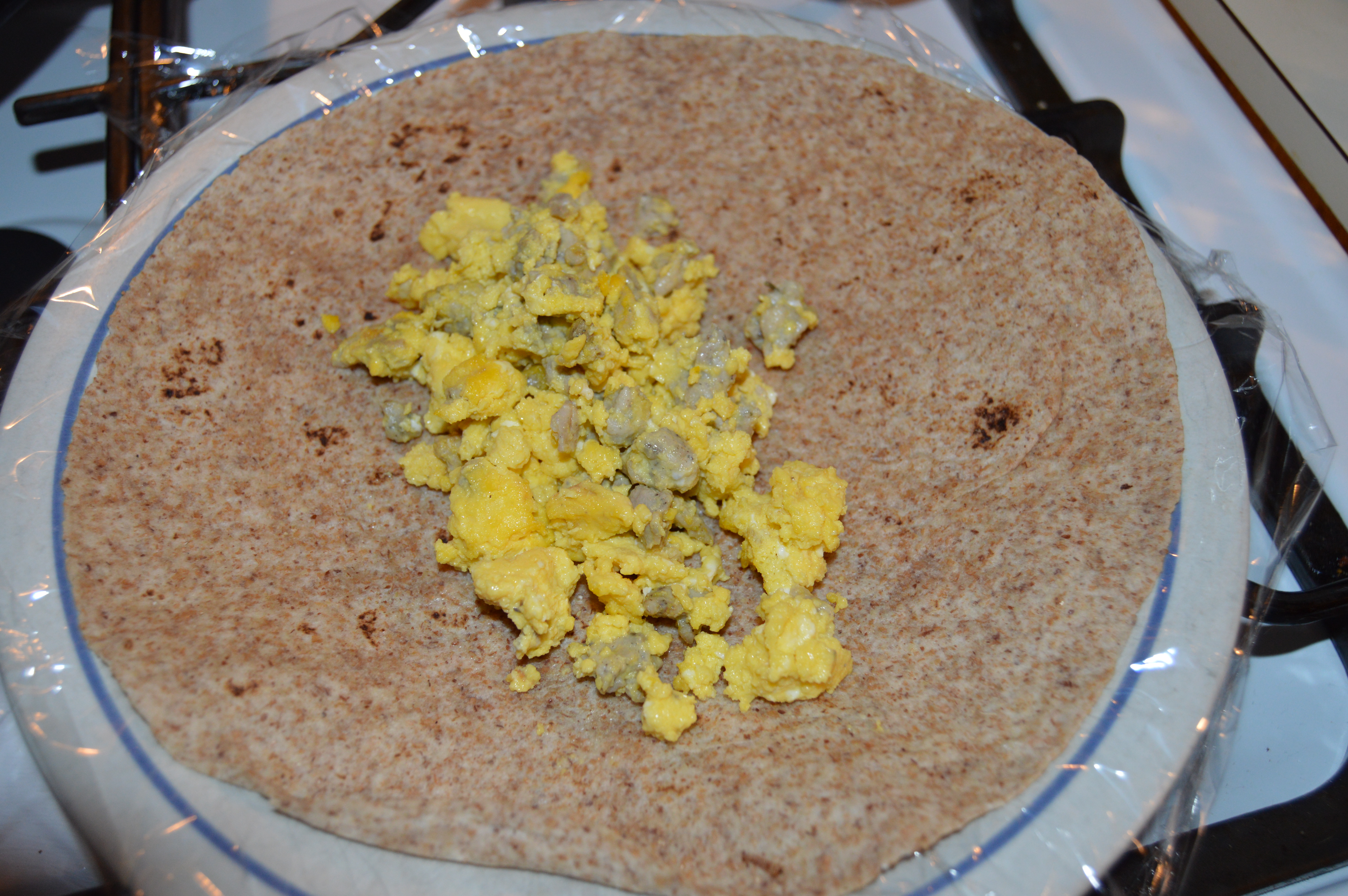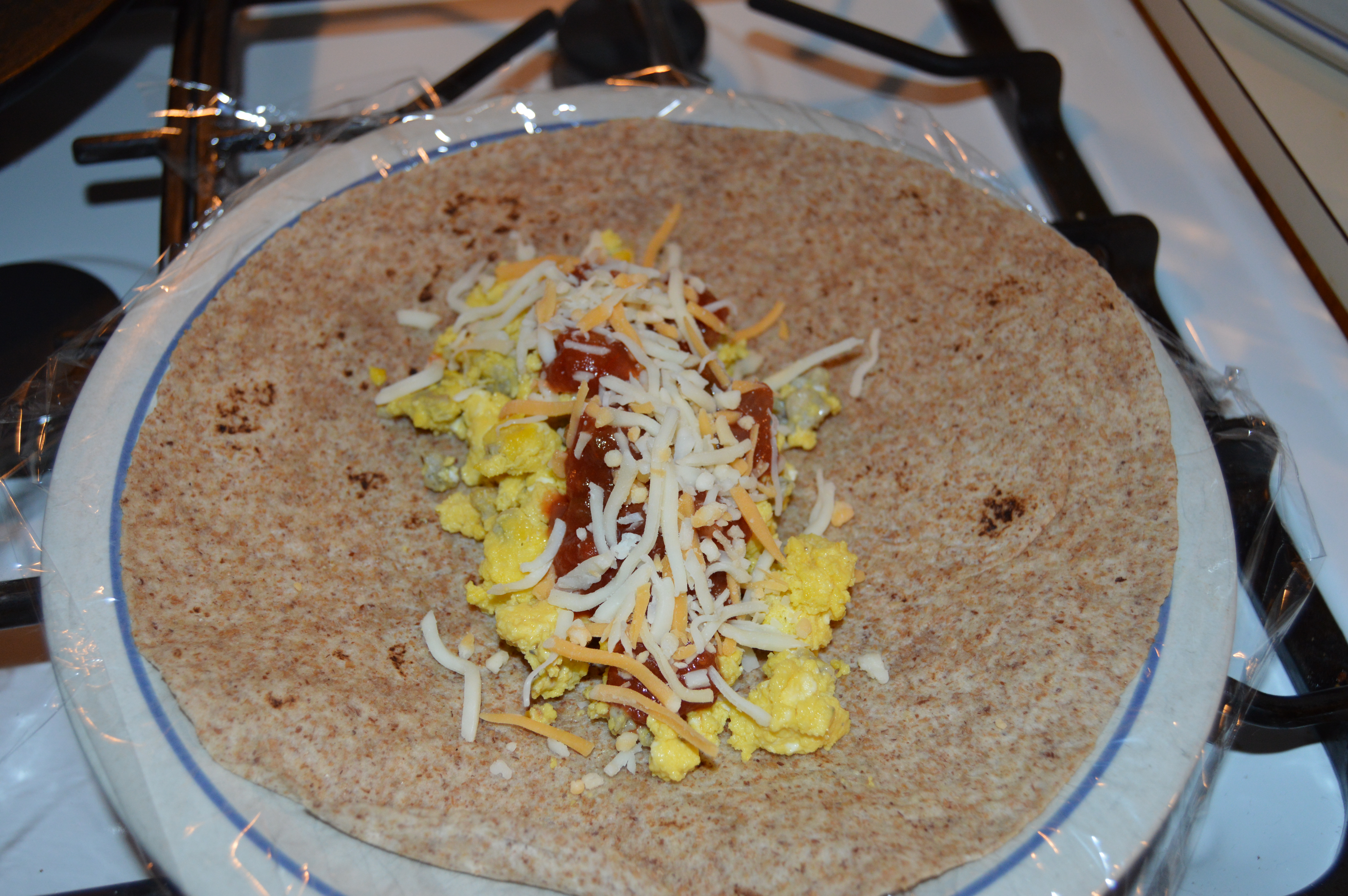 Now let's build the burritos. I placed a length of plastic wrap on my assembly plate. On top of that went the whole wheat tortilla followed by some of the scramble. On top goes some salsa and a bit of cheese. We always have salsa and cheese in the house. Roll the tortilla up then wrap the whole thing in the plastic wrap.