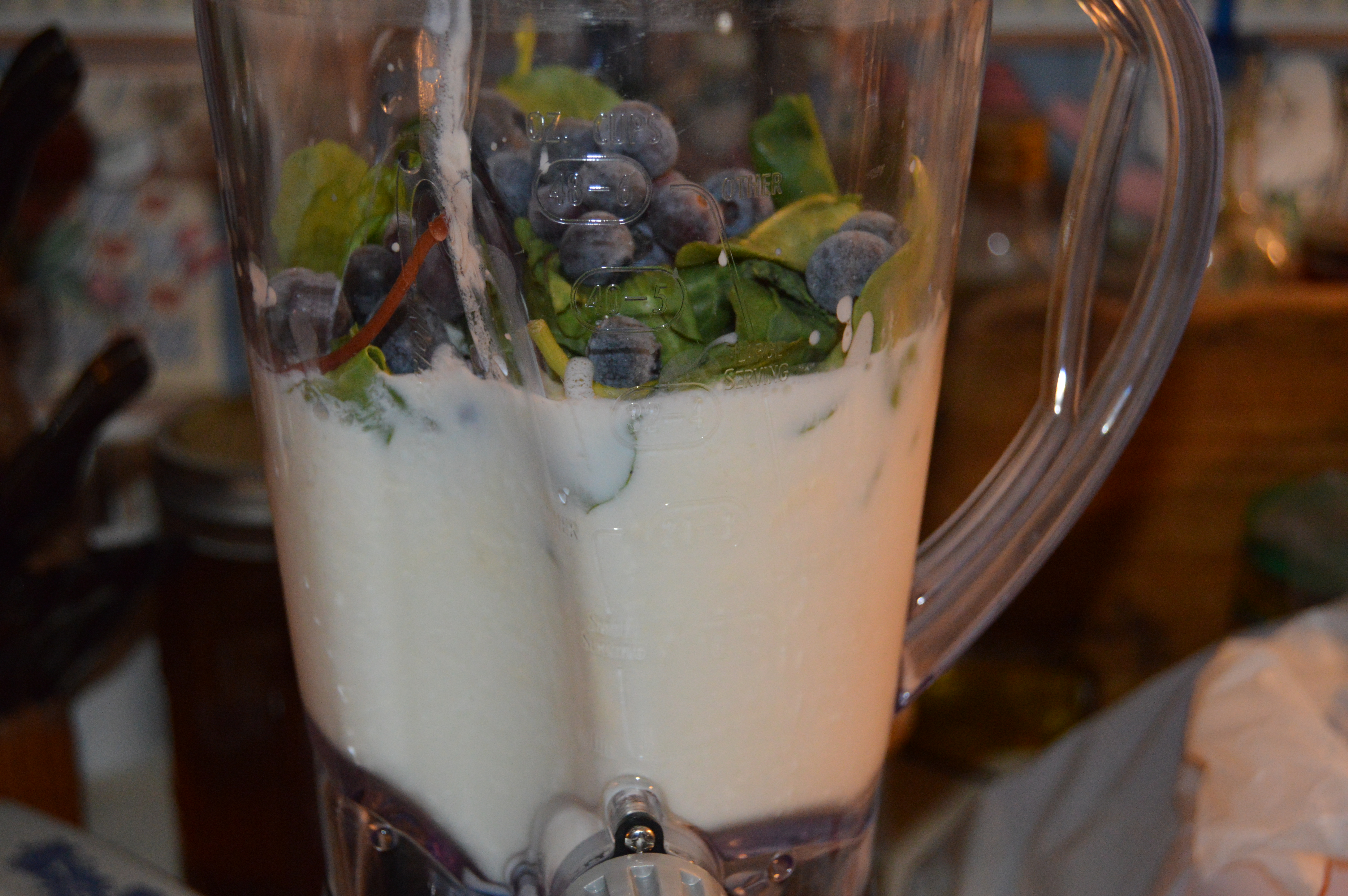 Then in goes the fruit. I have used several combinations depending on what we might have in the house but there is usually a banana then some frozen strawberries and blueberries from the homestead. I have also used kiwi which adds a nice tang to the smoothie. Now that apple season is here I want to try a apple cinnamon smoothie which I think would be really yummy and cinnamon is really good for you too.